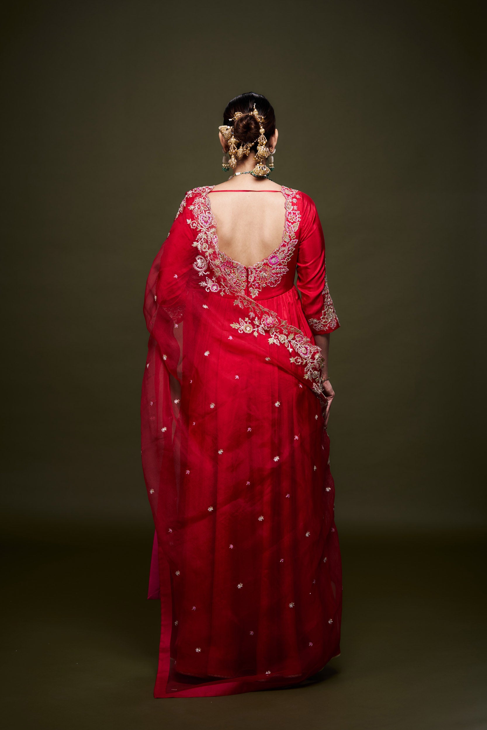 Description: This is a Crimson Red dress with heavy cutdana & zardozi hand embroidered work & dupatta with Aari work.