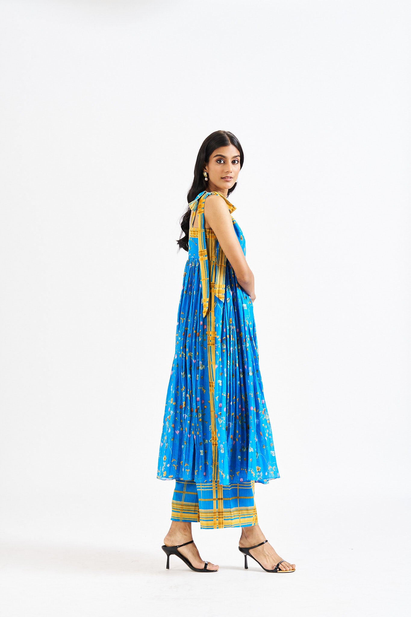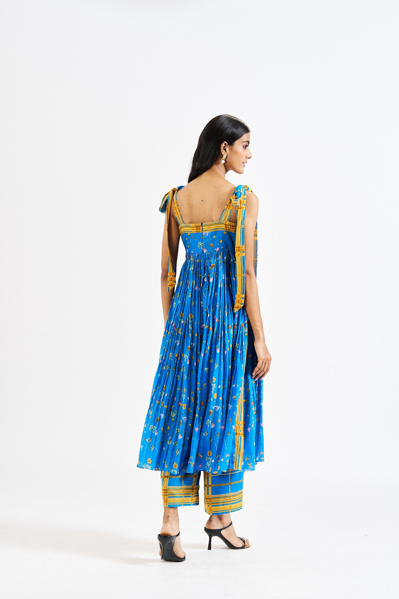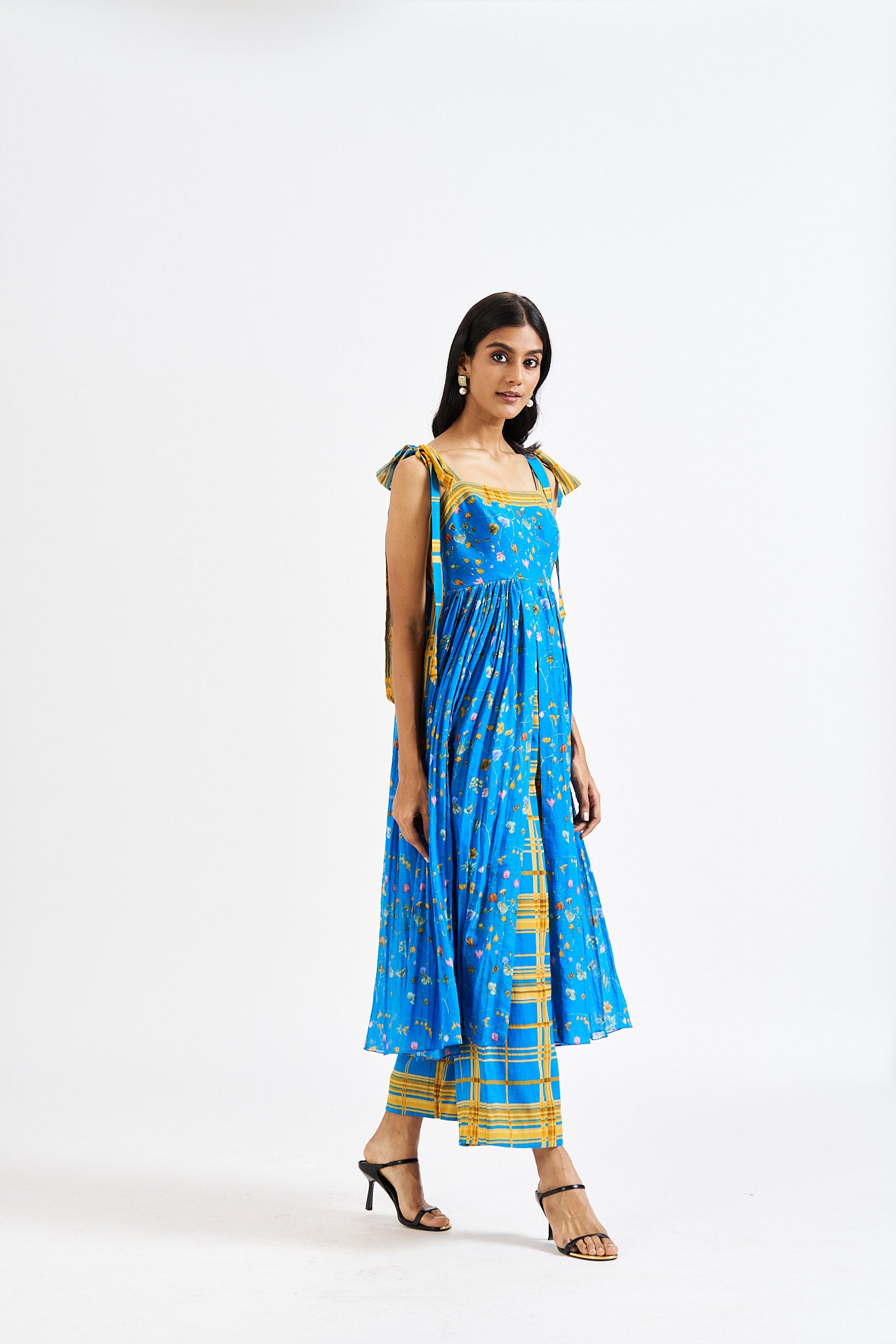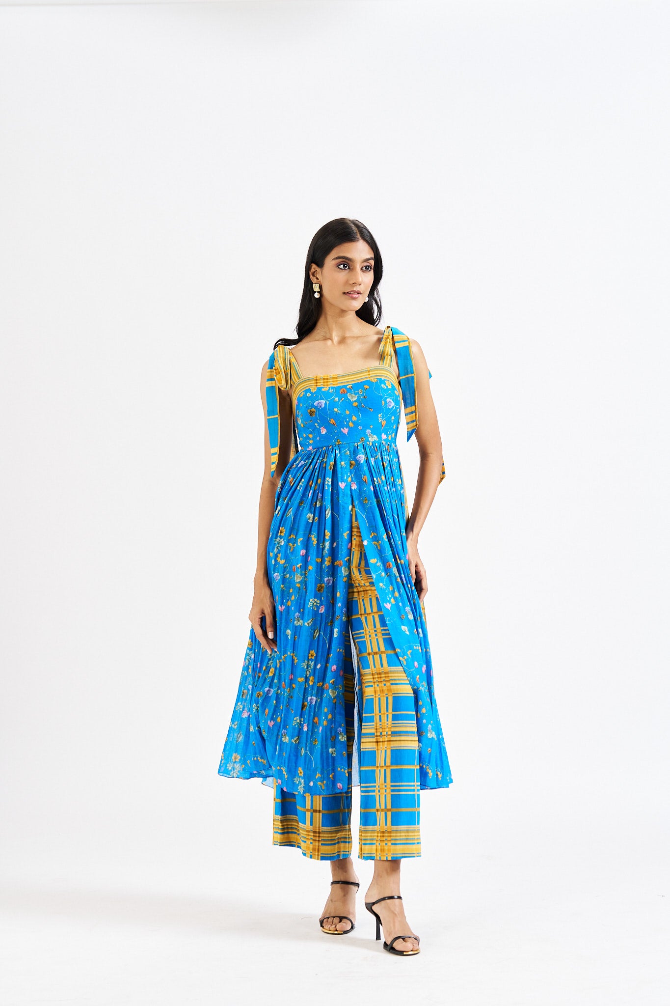 A coordinated top and bottom set in calming blue tones for a relaxed yet refined look.