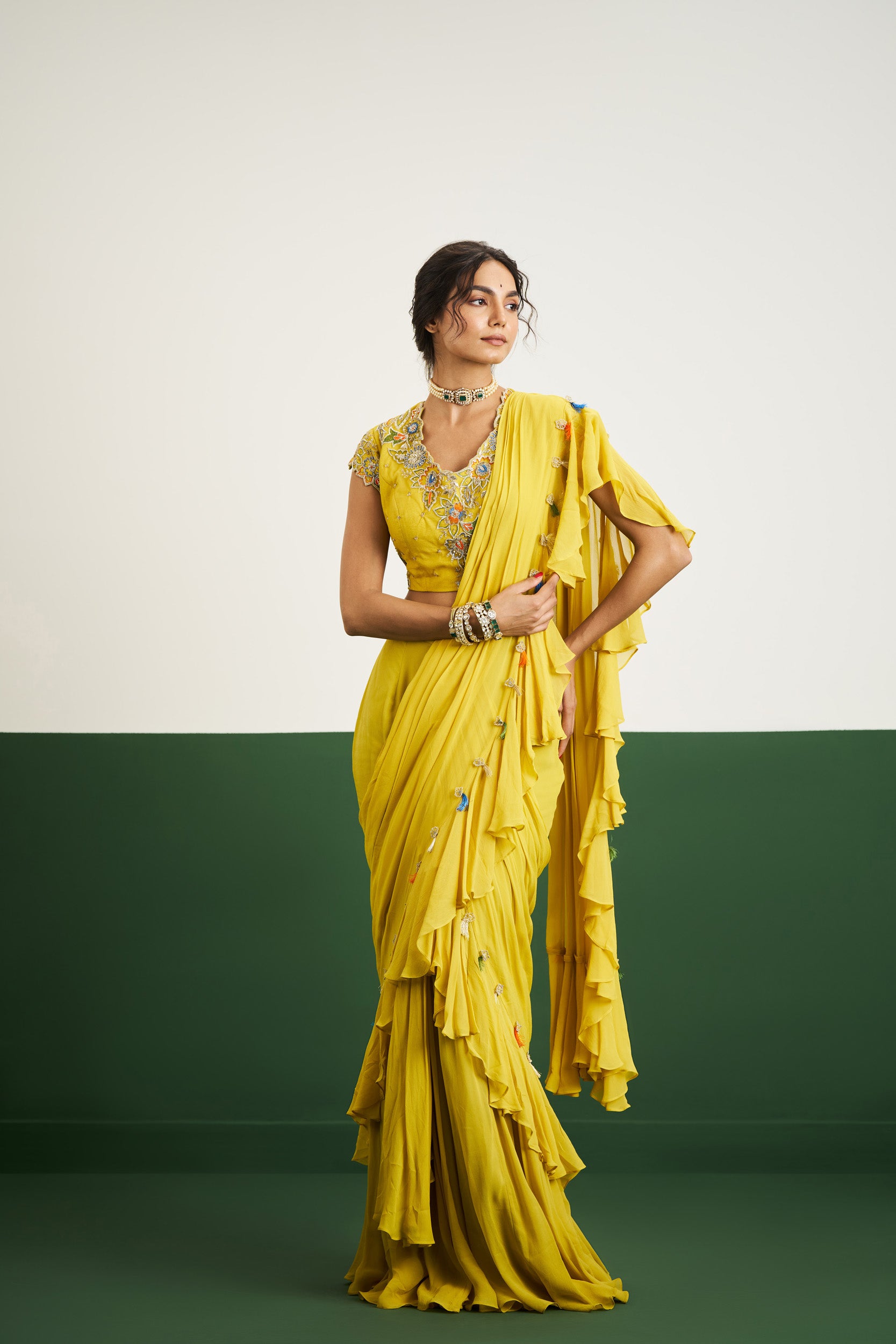 Description: Bold yet breezy, the Ziva Drape Saree Set in yellow brightens any occasion with its fluid silhouette and modern appeal.